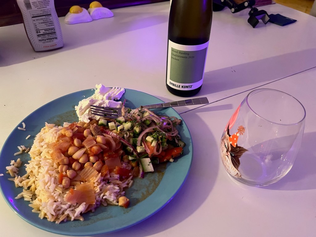 Served with Rice and Orzo Pilaf, Strained Yogurt, and onion, cucumber, tomato salad. I highly recommend these accompaniments to elevate the dish! Served with a qualitätswein (earlier harvest / less ripe / usually cheaper) riesling from Sybille Kuntz. This was a fine pairing, but could have been better. I didn’t take notes on it, but I’m guessing this didn’t have the fat/heat to call for a riesling. Maybe a light red or rosé a bit earthy and acidic could compliment the gaminess of the lamb, freshness of the salad and earthiness of the chickpeas?