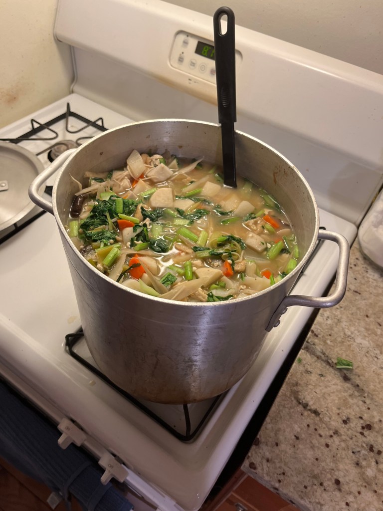 Looking to impress, I made sure to get very high-quality and thick konbu. The resulting broth was delicious and umami-packed. After boiling the vegetables in the broth, it became even more delicious. That being said, the preponderance of potatoey taro root in the soup was a bit fatiguing. I’d recommend cutting the taro, actually, and/or upping the amount of broth. Overall, guests complimented the soup, particularly those with dietary constrains, but the accompanying spicy chicken-tortilla soup that my housemate whipped up was about twice as popular (perhaps more as we ran out by midnight). I don’t believe that the increased popularity of the chicken-tortilla soup was due to its having meat. It was more tasty. Had I selected a better recipe, I believe the guests would have eaten all of it. My soup did have a novelty factor; guests got to try a bunch of new produce!