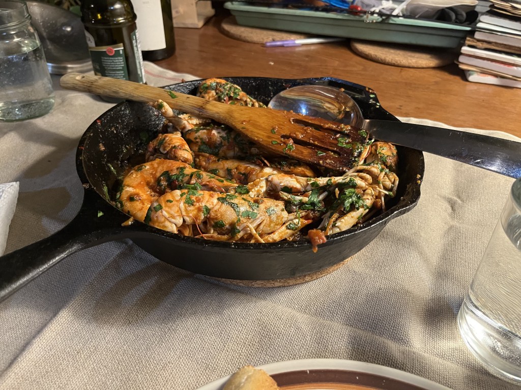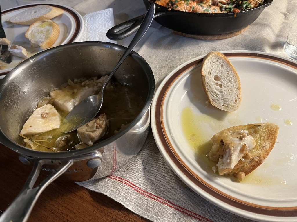 It turned out there was no need to worry. The resulting tomato sauce had a lovely and strong seafood flavor (someone at the table compared it to a really good puttanesca). I was very glad I included the prawns as they were big and juicy (they averaged around 4 oz. each). The langoustine meat was hard to get at and a bit flakier. Also, some of the prawns (guessing the females) had a particularly large amount of green slime along the vein; I’m guessing this was roe. I recommend being very careful to remove all of this as we noticed some of these shrimp with roe had an intense fishy flavor that wasn’t exactly pleasant to us. Again, served with toasted bread.