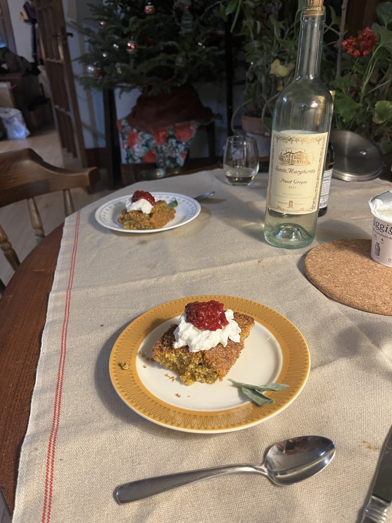 I selected this dish because I liked the idea of an herb-heavy baked dessert from Friuli. I later realized that this was not a traditional dish of the region, but the author’s take on what might fit in well with the local cuisine. Nonetheless, this dish was a hit. Everyone loved it! The large amount of rosemary was particularly nice alongside the salty hazelnut and corn. (There is actually more hazelnut meal than corn in the batter.) I made the berry-sage coulis with all raspberries. I would strongly recommend at least doubling the amount of coulis you make as it runs out too quickly. Also, when serving (even leftover), don’t forget to garnish with a sage leaf! The smell is important and delightful! Yogurt made a fine substitute for the buttermilk ice cream. One more tip for serving this the next day: it can get kind of crumbly, but this can be helped by leaving the cake open to the air for a couple hours for it to dry out a bit before attempting to cut and serve it.