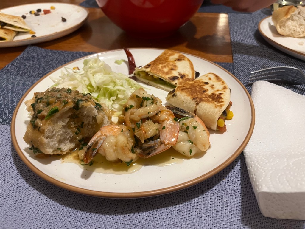 Fast forward 3 years and I’m ready to start experimenting with some of these again. The situation is we have bean-corn-cheese-avacodo quesadillas with a cabbage-lime salad on the side, and we want to make something small and tasty to compliment this. Sounds like a perfect plate to add some sautéed shrimp with garlic!