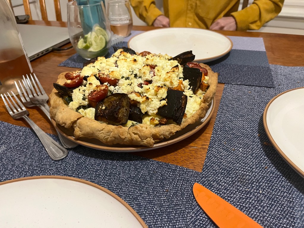 Cooking Notes: This tart is indeed very full – I’d recommend selecting a particularly deep tart pan, or go a bit lighter on some of the filling (e.g. choose small eggplants and sweet potatoes.) If you don’t reduce the amount of vegetables and have a deep enough pan, consider instead increasing the amount of binder (the egg and cream) to pull things together. Mix the binder thoroughly. 11oz of pie crust should be around half a recipe for a full pie. Don’t forget to pick up some beans as pie weights. Blind-baking the pie crust may require a higher temp or longer than stated; make sure it gets golden-brown.
