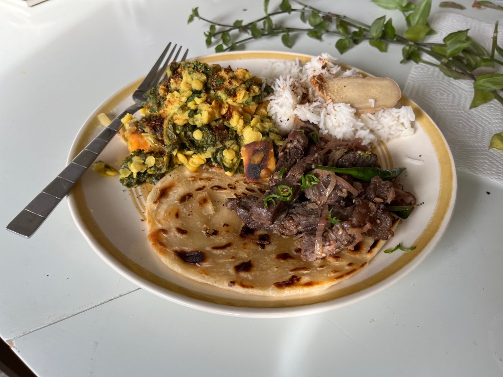 Cooking Notes: Chop the kale before adding it to the dal. There will be a lot of kale if you weigh it dry. I definitely recommend adding roasted sweet potato. As suggested, drain 80% (or even 90%) of the water from the dal – the kale will still cook in the mostly-dry lentils and the result have a better consistency. Don’t forget to season the dal at the end; it will need salt. I recommend watching videos online of ways to fold paratha (it’s easier to make these than one might expect – make extra!) For the beef – get the cast iron as hot as it will go (I put it in the oven on max temp.) Finally, I forgot to add the lime and dried chiles to the dal at serving, and the lemongrass to the beef – don’t forget this stuff!