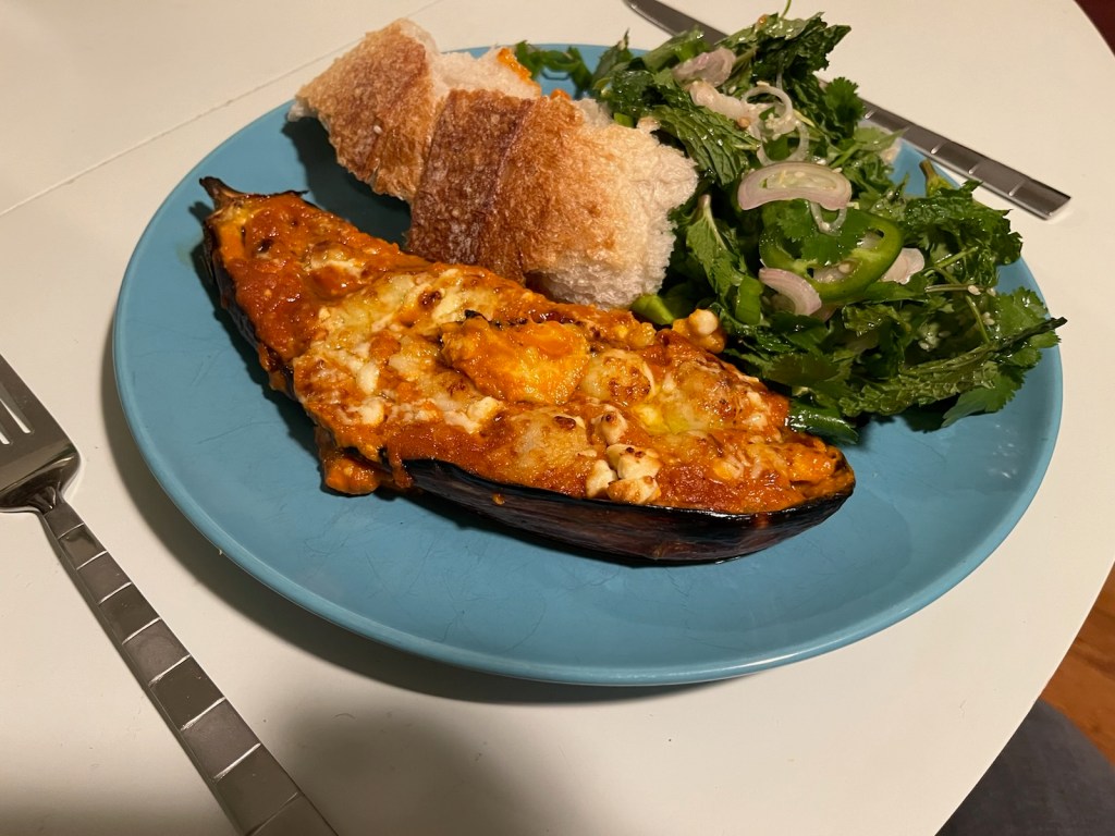 Notes: Roast that eggplant hot and near the top of your oven (I’d do 500F next time) as it’s difficult to get it browned in the allotted time (before they deflate into eggplant-shaped pancakes!) You may notice that my sauce is more orange than in the cookbook’s picture. This is because I blended on high speed which creates a very fine emulsion (I like that!) If you want a red sauce though, just be careful to blend on low-ish speed. Finally, note that I actually forgot to include the cream in the cheese mixture – I poured it over about a minute after the cheese had been in the oven. This attempt at a fix was largely ineffective as the cheese remained in gobs.