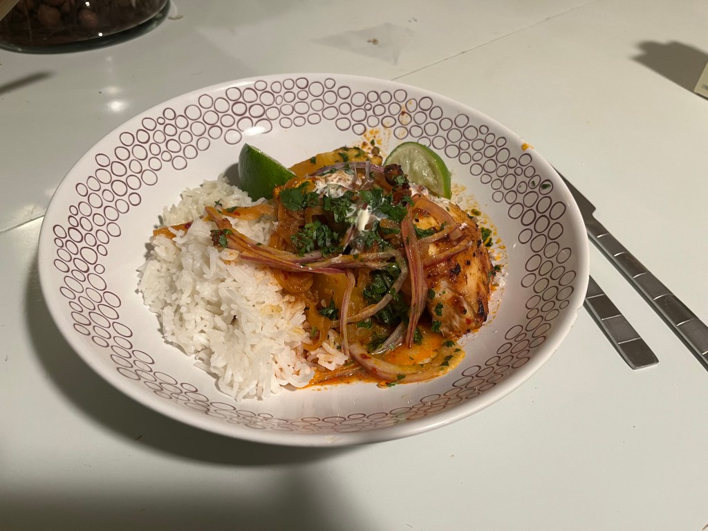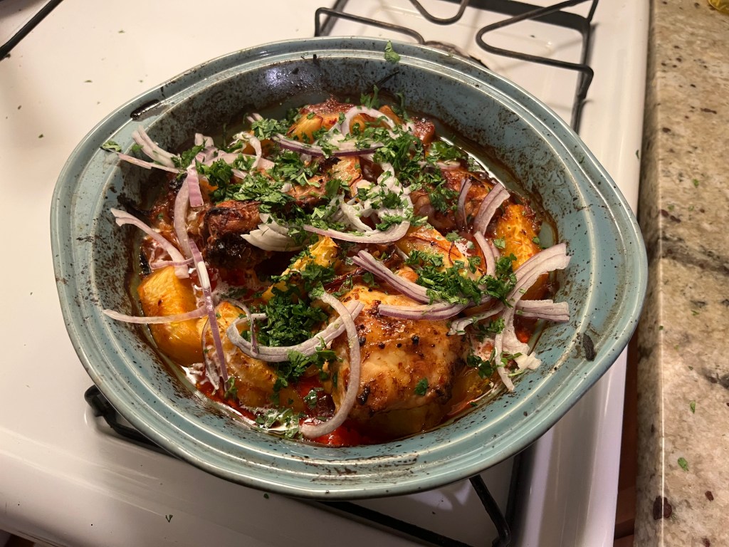 Cooking & Tasting Notes: be sure to use a shallow pan (as opposed to a dutch oven), otherwise there is no way to crisp the skin. I tried broiling my dutch oven and forgot about it and the skin still did not crisp much, whereas the shallow Earthenware pan crisped according to the written instructions. I marinated the chicken in the ‘nduja-chipotle paste for about 4 hours so it could at least brine. The dish is significantly under-salted as written, I’d recommend doubling the salt in the paste and adjusting to taste part-way through the bake. The pineapple didn’t really blacken or caramelize at all. Next time, I would pull half of the pineapple and caramelize it, and the other half I could maybe even try pickling in lime juice and habanero? It is important that at least half of the pineapple be cooked in the juices with the chicken to lend their flavor, so some troubleshooting would be needed. Finally, I served this with rice, but I’d recommend experimenting with bread or another starch, as well as a green vegetable on the side.