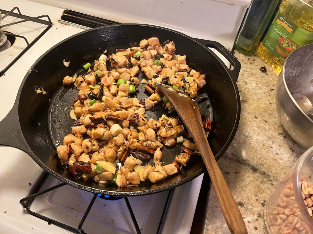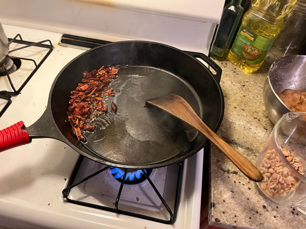 Gong Bao Chicken (also commonly transcribed as Kung Pao Chicken) is a Chinese stir-fry, meaning in a commercial kitchen it will be cooked over a burner with almost ten times the heat output compared to a residential stovetop burner. Because of this, I opt to use two burners on my 15-inch cast iron to get a similar effect. The heat builds up in the middle of the pan for when I need it to rapidly cook the chicken, but until then, I cook off to the side where there is less heat content.