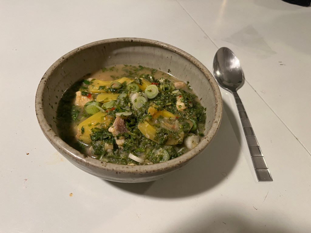 Cooking Notes: The curry paste did not get as uniform as I would have liked (see image), but I think this was ok. I used fresh catfish instead of dried and reduced the amount of water in the base by 1.5 cups, which was perfect. The added 2 tsp of sugar was totally unnecessary. It comes out more of a stew than a curry texture. Next time, I would experiment with blending the liquid, paste, and a portion of the jackfruit into a thicker curry sauce. There is a lot of jackfruit in the balance, so blending a bit while cutting sugar will help to consume it more evenly with the catfish. Save the greens additions for individual serving garnishes if you are preparing for others. Note: this book generally doesn’t make explicit salt additions, so make sure you are doing them.
