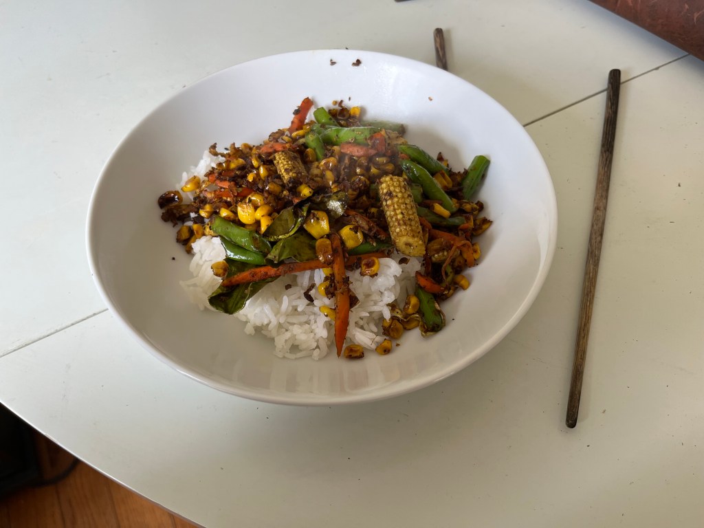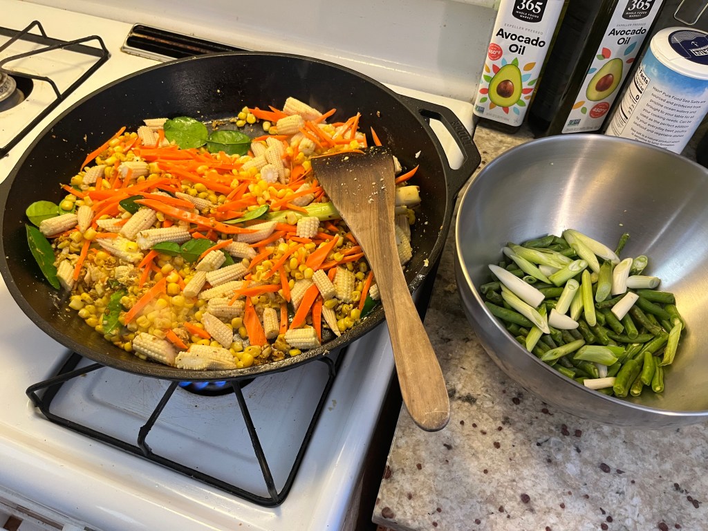 The golden-vegetable stir-fry focused on corn. It would probably be best to make this one when corn is in season, bet it was tasty and attractive even with frozen corn. I was able to get the baby corn at my local Asian market (Hmart). It could use a little more oil in the stir-fry, but otherwise the preparation was straightforward.