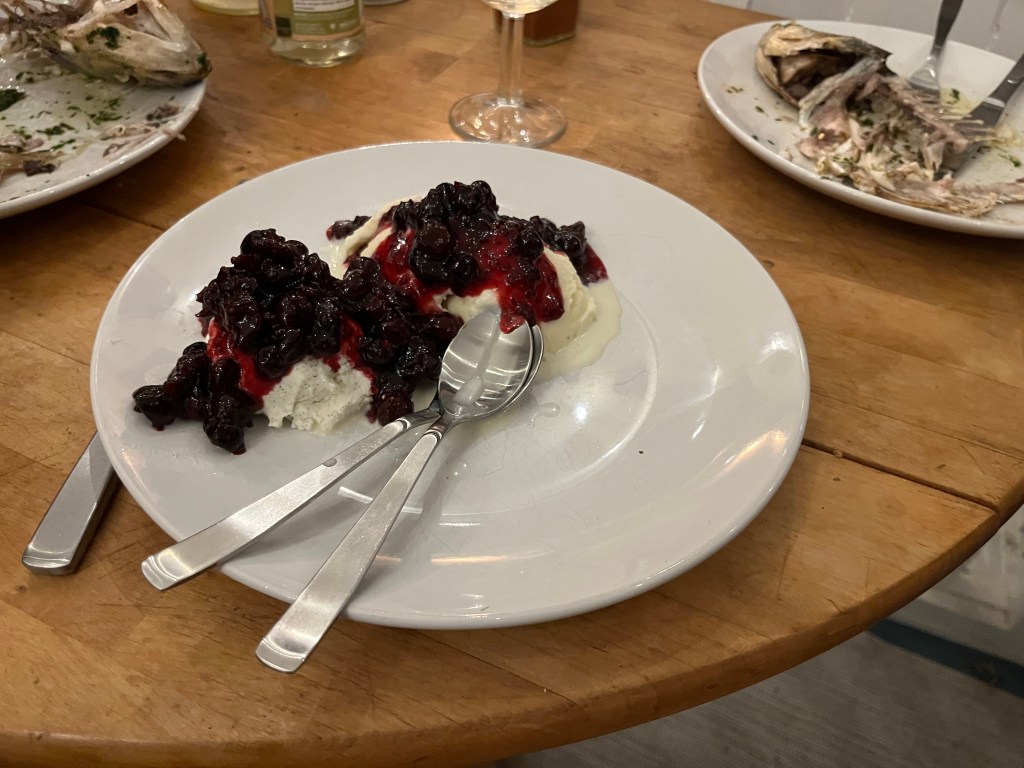 Time to build a dinner around garden-fresh green tomatoes! I decided to fry the tomatoes according to two different recipes: one from Lost Kitchen, the other from On Vegetables (tl;dr: Lost Kitchen wins even though it is easier.) For the main, I decided on a whole Sea Bream, which is available at New Deal Fish Market and feels appropriate for the dog days of summer. Finally, I got ahold of some fresh blackcurrants at The Mushroom Shop and decided to take a stab at a strained ricotta dessert from Nopi.