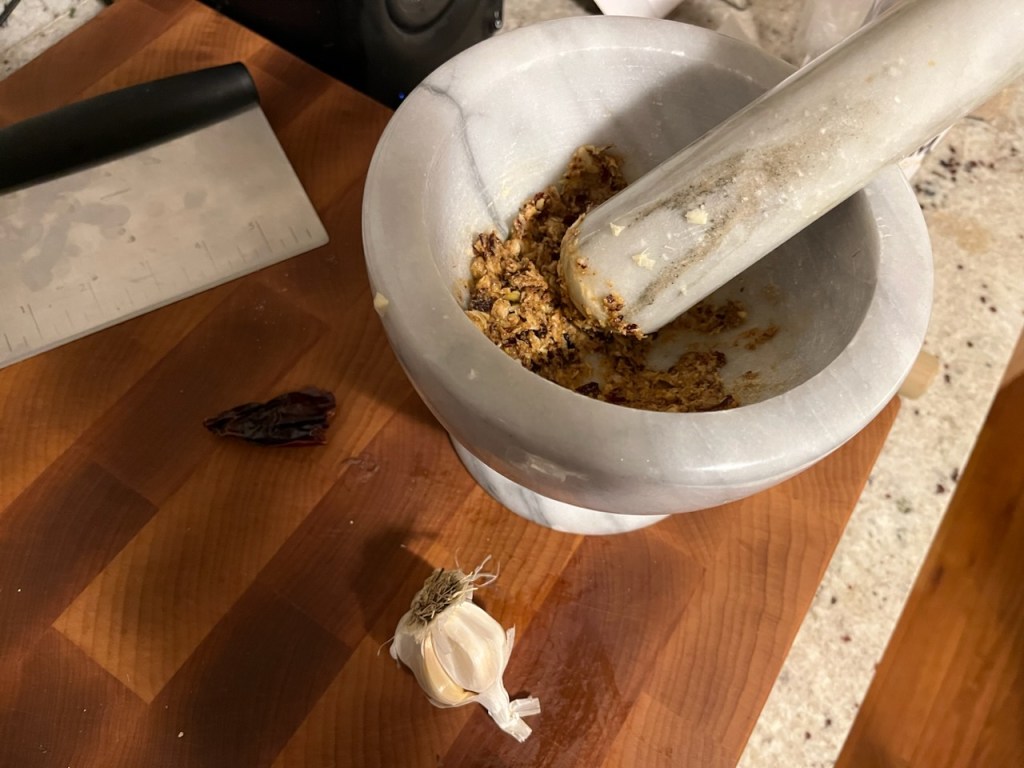 This recipe features a pork tenderloin cut into large cubes and marinaded in a smokey-spice paste with wine. The marinade has very little salt; I’ll have to see what Harold McGee has to say about salt in marinades, but I normally think of brining pork as a good thing. (McGee says that marinades use acidity to tenderize the meat and help it retain moisture while also infusing flavor. I think the reason the marinade does not use much salt is because the liquid is traditionally added back into this dish to form the broth. Brines typically have a high salt content, meaning one could easily over-salt this dish if the marinade is also a brining liquid and that is added to the broth. At the same time, I would recommend adding as much salt as you think the dish will later need to the marinade as it should only improve the meat and dish, especially if the salt is added to the paste rather than after the wine if poured over.) The dish and a side of “Sautéed Kale with Pine Nuts and Onions” took about 3.5 hours to make.