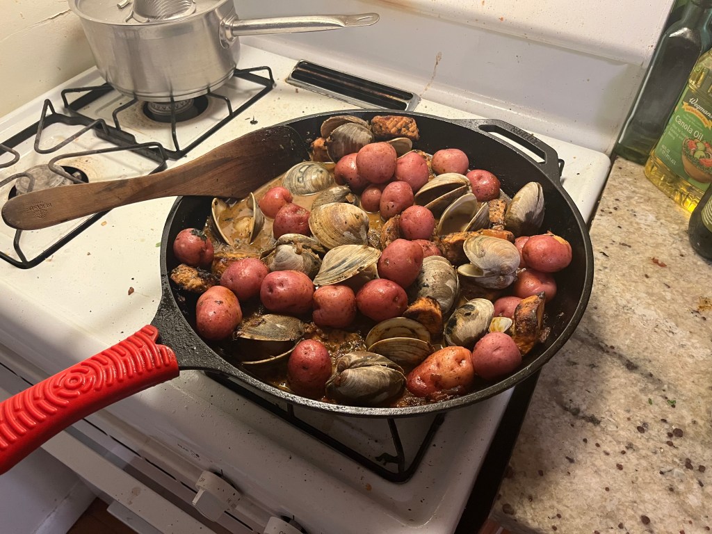 Cooking Notes: Select small new potatoes. You may also notice that the image in the book depicts more traditional roasted potato cubes, which I’d like to try next time. I would add salt to the marinade as the pork came out dry. When browning the pork, don’t use too high of heat as the marinade has lots of garlic in it that will turn into a black glob of carbon (or just be careful to remove this glob.) When cooking, make sure the pork is evenly submerged and try to cook it to temperature (so add it later to the pan than the clams and experiment with a thermometer. Also, maybe add more liquid if you’ve lost more than expected.) I cooked a lot of the liquid out of the kale and liked this. If you are using cider vinegar instead of wine, go easy on it and taste frequently. Remember to heavily salt the water for your kale.